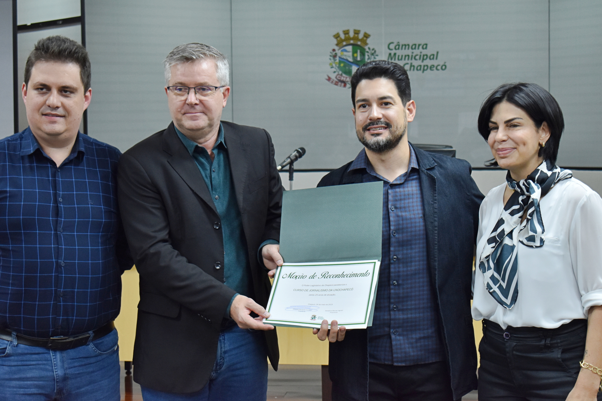 Prevista no Regimento Interno da Câmara, uma moção é uma maneira de homenagear instituições ou pessoas que fizeram grande diferença, que se destacaram de maneira positiva em suas comunidades. Na tarde da última quarta-feira, dia 28 de junho, foi entregue na Câmara de Vereadores de Chapecó, uma Moção de Reconhecimento, em virtude dos 25 anos de história do curso de Jornalismo da Unochapecó.
