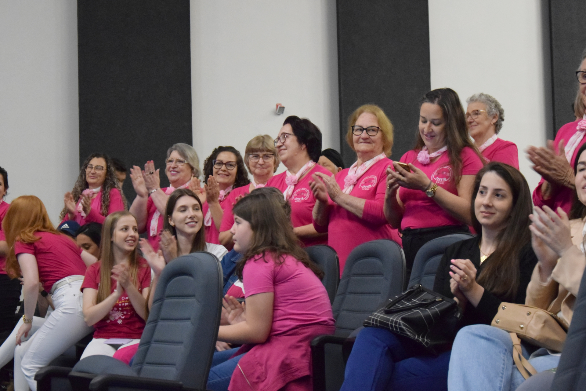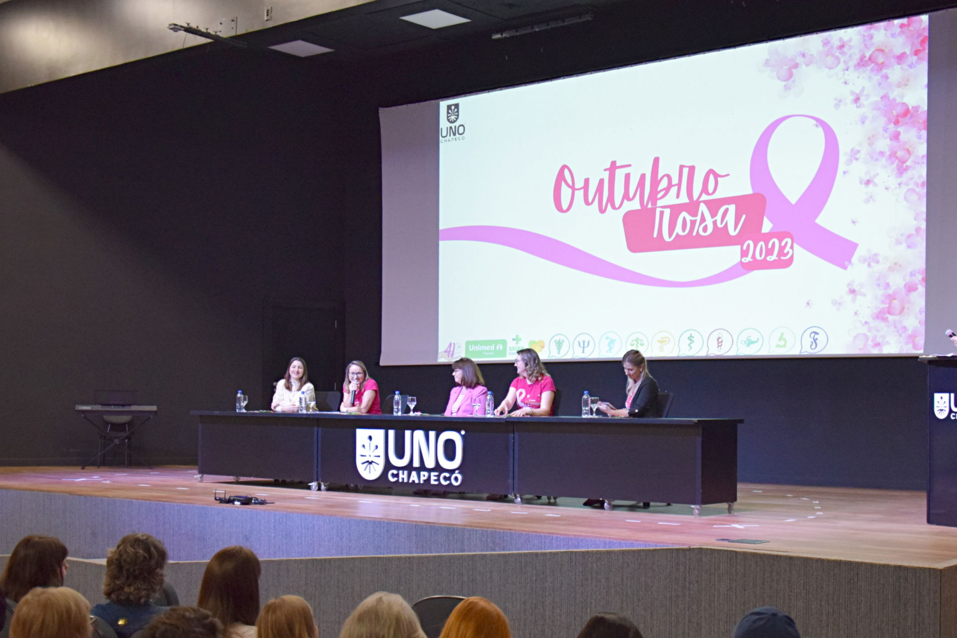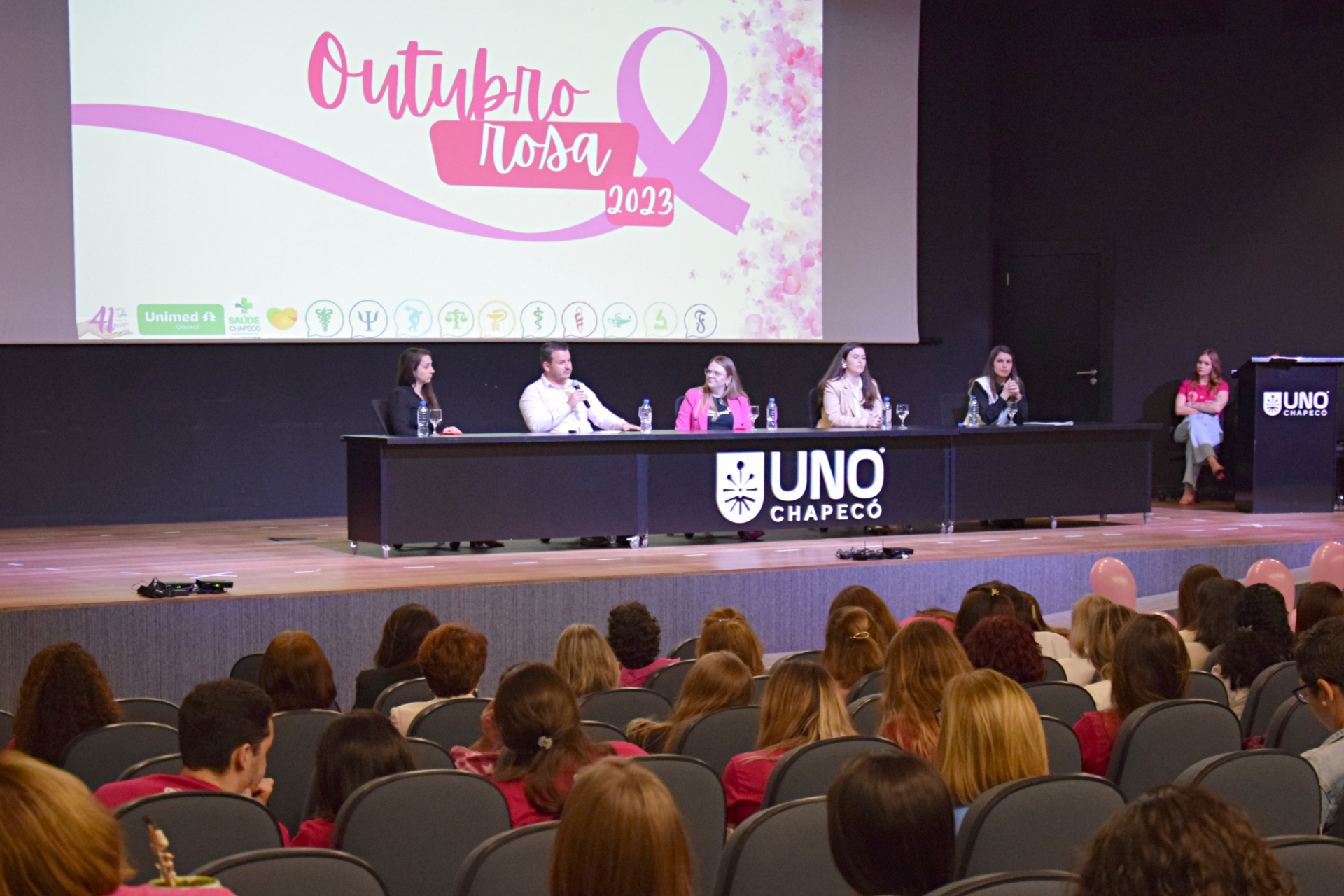 Na noite desta quinta-feira (05/10), o Salão Nobre recebeu a comunidade acadêmica e convidados mais que especiais para o evento que marcou, de forma oficial, a abertura do Outubro Rosa na Unochapecó. Além de acadêmicos, técnicos e docentes, também somaram forças ao evento a Secretaria Municipal de Saúde, o Hospital Regional de Chapecó, o Hospital da Unimed Chapecó, a RFCC e as mulheres do Grupo Programa Viver Melhor (Provim).
